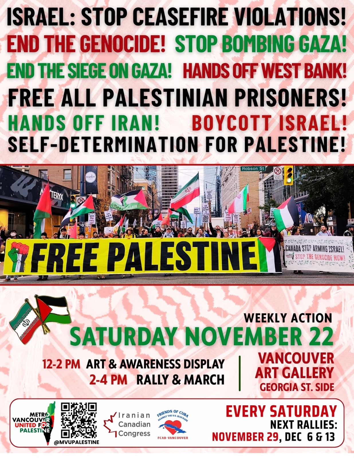 Organized or Endorsed by MAWO Israel: Stop Ceasefire Violations! End the Genocide! Stop Bombing Gaza! End the Siege on Gaza! Saturday November 22 & EVERY Saturday 12pm - 4pm Vancouver Art Gallery Georgia Street Side 12pm - 2pm - Art & Awareness Display ** Photo & video exhibition, info booth, cultural activities & vendor 2pm - 4pm - Speaker, Rally & March Bi-Weekly Banner Drop For Palestine & Iran! Israel: Stop Ceasefire Violations! Israel: Stop Bombing Gaza! End The Siege On Gaza Now! Self-Determination For Palestine! Thursday November 27 4:30pm Call for location: 778-881-6156 Next Bi-Weekly Action: Thursday December 11 From Ceasefire to Palestinian Liberation, We Will Win! Statement by Mobilization Against War and Occupation - MAWO