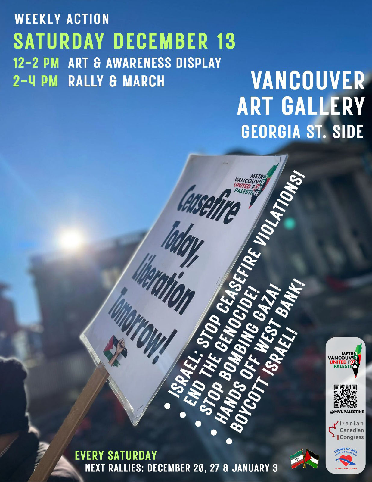 Organized or Endorsed by MAWO Israel: Stop Ceasefire Violations! End the Genocide! Stop Bombing Gaza! Hands Off West Bank! Boycott Israel! Saturday December 13 & EVERY Saturday 12pm - 4pm Vancouver Art Gallery Georgia Street Side 12pm - 2pm - Art & Awareness Display ** Photo & video exhibition, info booth, cultural activities & vendor 2pm - 4pm - Speaker, Rally & March From Ceasefire to Palestinian Liberation, We Will Win! Statement by Mobilization Against War and Occupation - MAWO