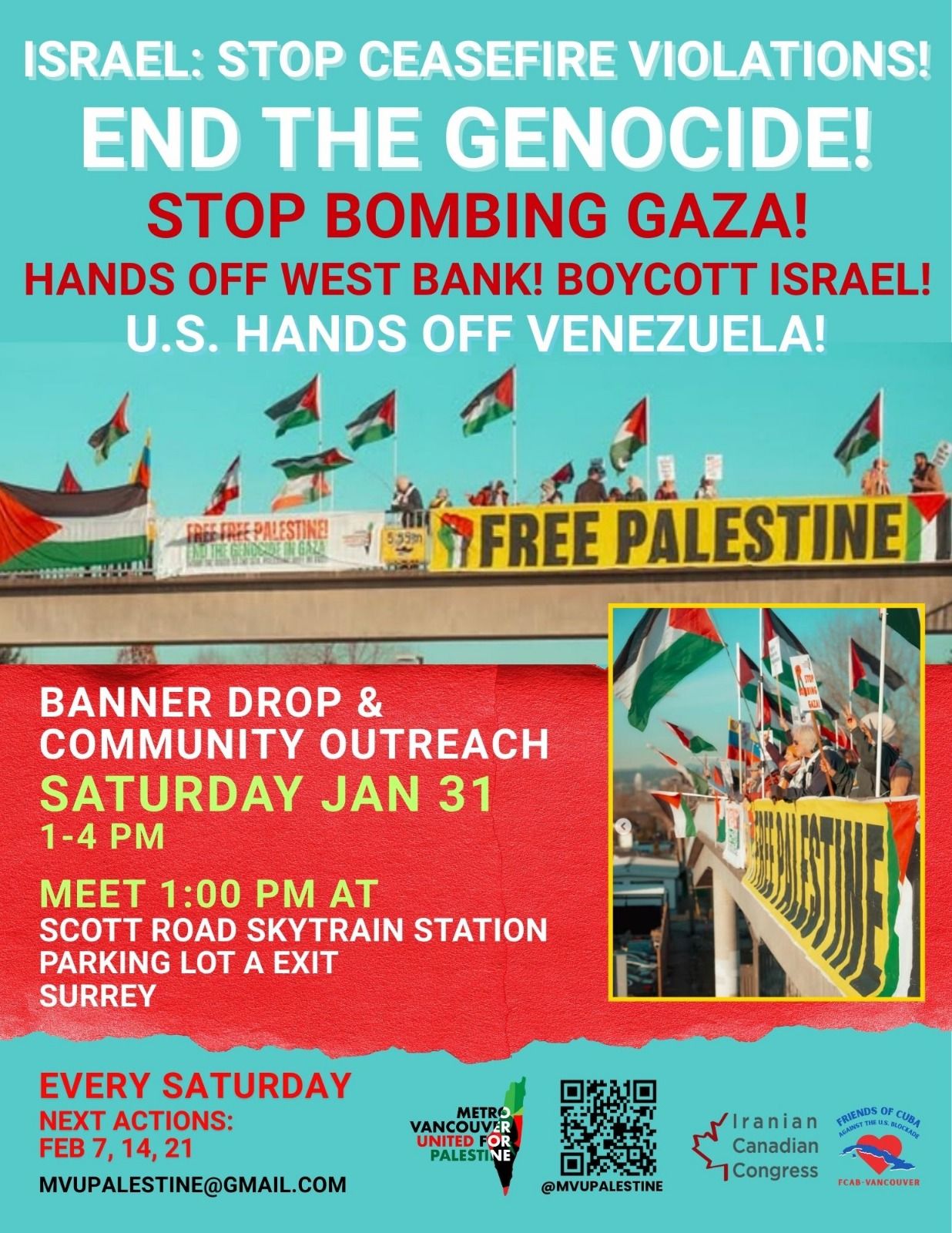 Organized or Endorsed by MAWO Banner Drop & Community Outreach Israel: Stop Ceasefire Violations! End the Genocide! Stop Bombing Gaza! Hands Off West Bank! Boycott Israel! U.S. Hands Off Venezuela! Saturday January 31 1-4pm Meet 1:00pm at Scott Road Skytrain Station Parking Lot A Exit Surrey From Ceasefire to Palestinian Liberation, We Will Win! Statement by Mobilization Against War and Occupation - MAWO