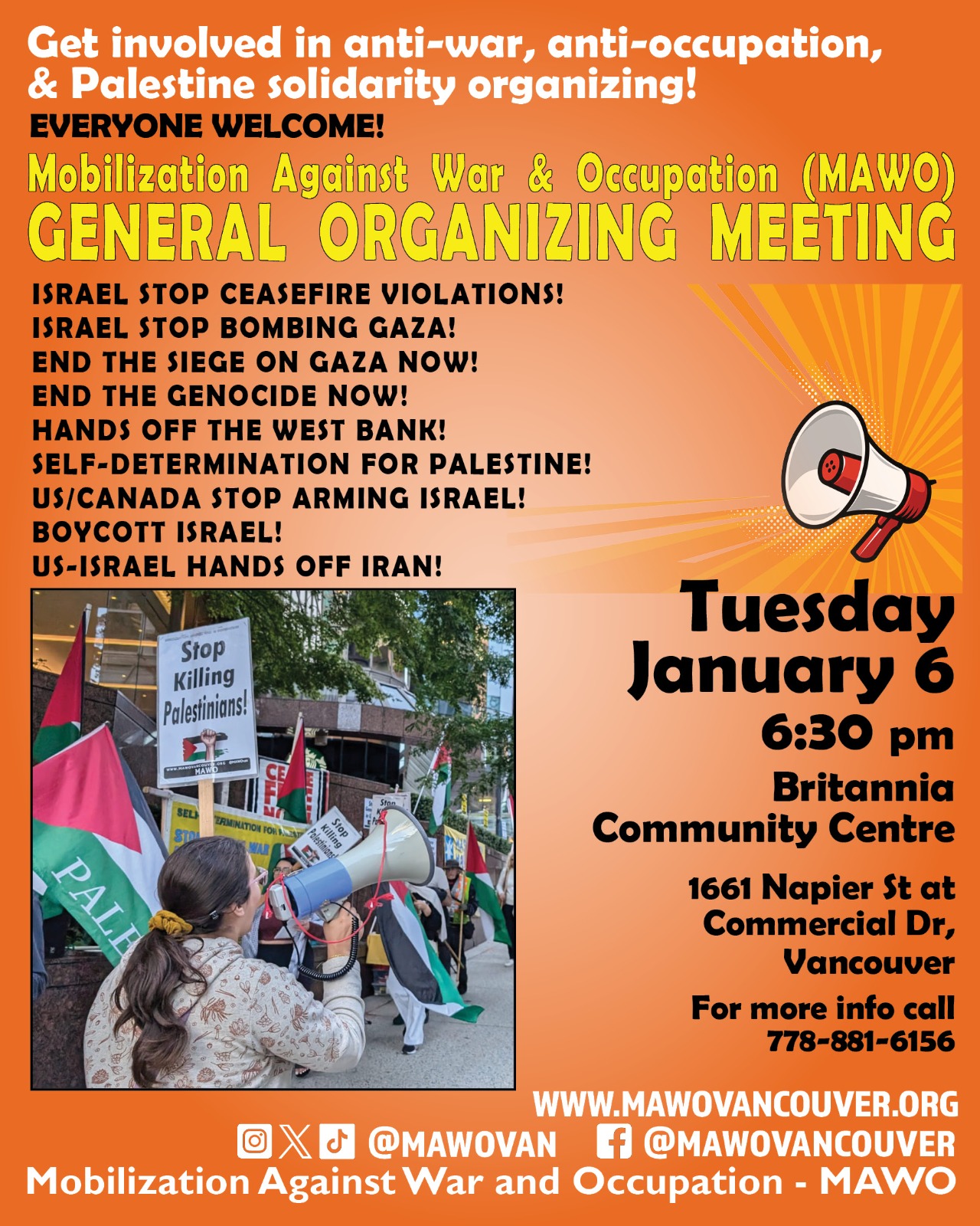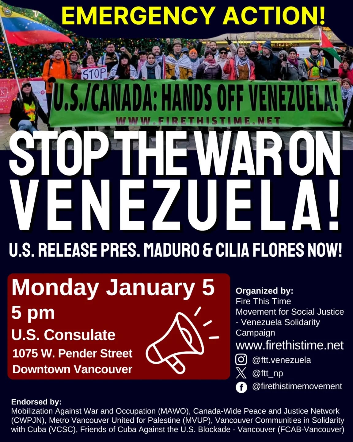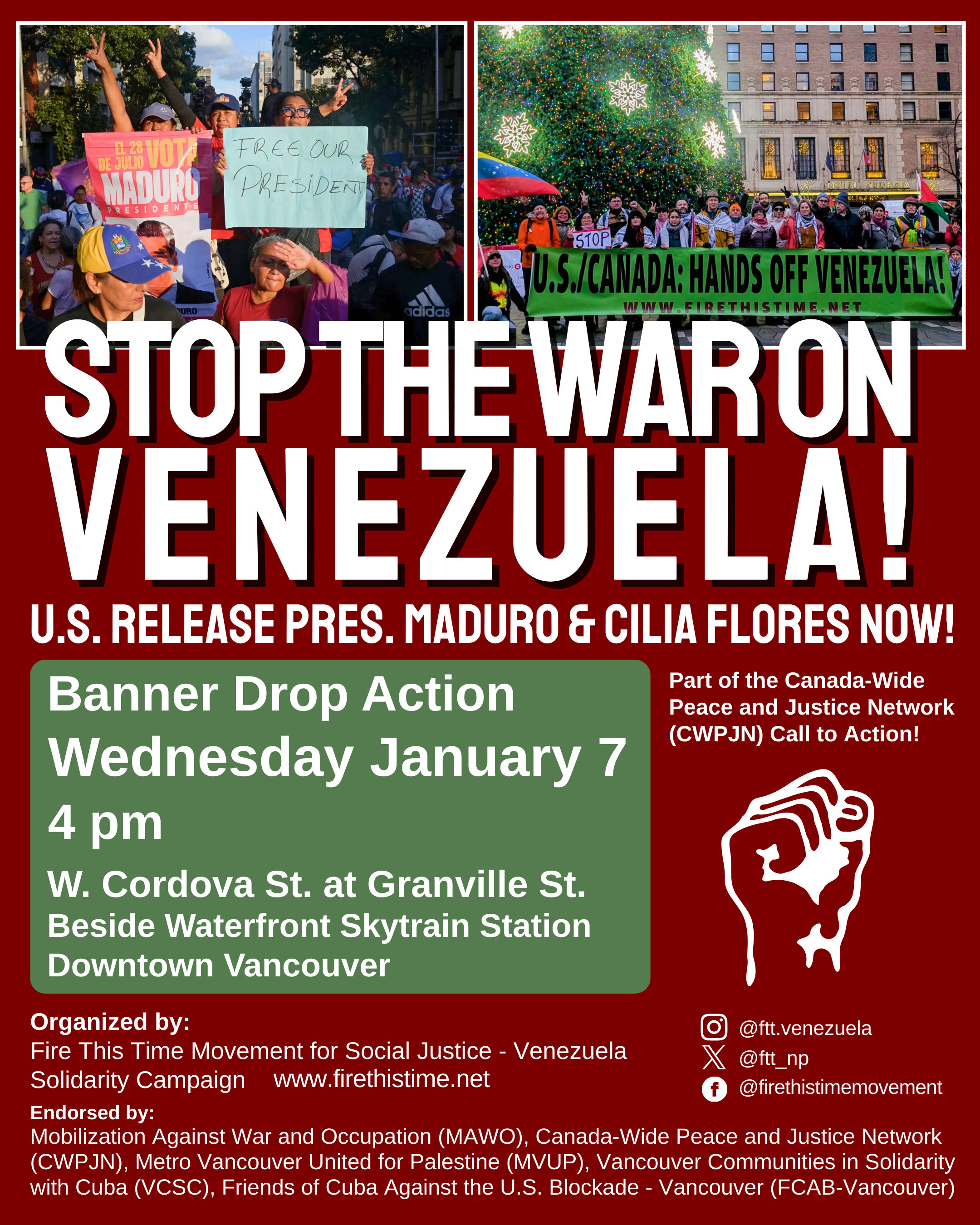Organized or Endorsed by MAWO January 7, 2026 Banner Drop Action Stop The War On Venezuela! U.S. Release Pres. Maduro & Cilia Flores Now! Wednesday January 7 4pm W. Cordova St. at Granville St. Beside Waterfront Skytrain Station Downtown Vancouver Organized by: Fire This Time Movement for Social Justice - Venezuela Solidarity Campaign Endorsed by: Mobilization Against War and Occupation(MAWO), Canada-Wide Peace and Justice Network(CWPJN), Metro Vancouver United for Palestine (MVUP), Vancouver Communities in Solidarity with Cuba(VCSC), Friends of Cuba Against the U.S. Blockade - Vancouver(FCAB-Vancouver) From Ceasefire to Palestinian Liberation, We Will Win! Statement by Mobilization Against War and Occupation - MAWO