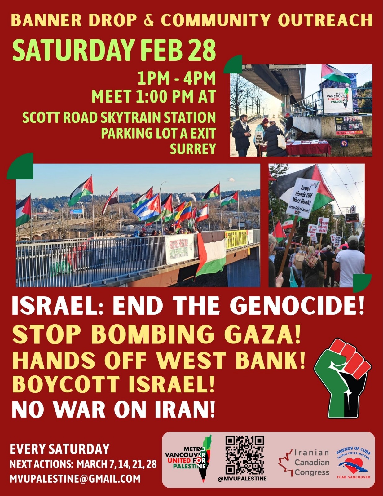 Organized or Endorsed by MAWO Banner Drop & Community Outreach Israel: End the Genocide! Stop Bombing Gaza! Hands Off West Bank! Boycott Israel! No War On Iran! Saturday February 28 1-4pm Meet 1:00pm at Scott Road Skytrain Station Parking Lot A Exit Surrey From Ceasefire to Palestinian Liberation, We Will Win! Statement by Mobilization Against War and Occupation - MAWO
