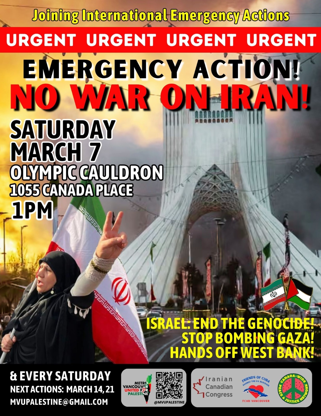 Organized or Endorsed by MAWO Joining International Emergency Actions Emergency Action! No War On Iran! US/Israel Stop Bombing Iran! Saturday March 7 1pm Olympic Cauldron 1055 Canada Place Vancouver 2016 International Al Quds Day! End The Genocide in Gaza Now! No War On Iran! Rally & March Saturday March 14 1-4pm Olympic Cauldron 1055 Canada Place Vancouver From Ceasefire to Palestinian Liberation, We Will Win! Statement by Mobilization Against War and Occupation - MAWO