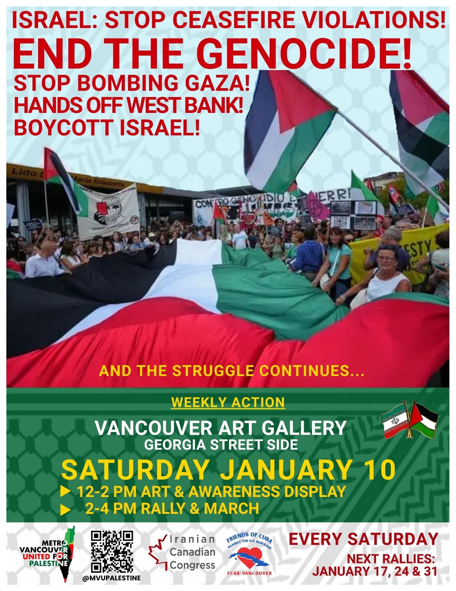 Organized or Endorsed by MAWO Weekly Action Israel: Stop Ceasefire Violations! End the Genocide! Stop Bombing Gaza! Hands Off West Bank! Boycott Israel! Saturday January 10 & EVERY Saturday 12pm - 4pm Vancouver Art Gallery Georgia Street Side 12pm - 2pm - Art & Awareness Display ** Photo & video exhibition, info booth, cultural activities & vendor 2pm - 4pm - Speaker, Rally & March From Ceasefire to Palestinian Liberation, We Will Win! Statement by Mobilization Against War and Occupation - MAWO